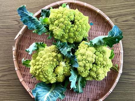 ★R7年10月23日、ロマネスコ苗を移植しました。(写真⇒左) ★R8年3月7日、今年は干ばつのせいで大きく成長しなかったのですが、花芽の収穫が出来ました。(写真⇒右)