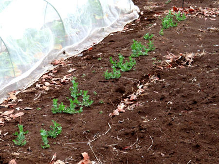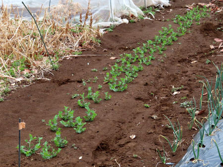 ★R7年11月26日、キヌサヤの種を蒔きました。 ★R8年2月26日、冬を越したキヌサヤの様子です。(写真⇒左) この後少ししたらネットをはります。
