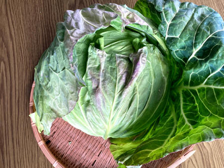 ★R7年12月3日、キャベツの葉が大夫巻いてきています。(写真⇒左) 既に収穫しても良い大きさになっています。 ★R8年1月5日、放置していたキャベツを収穫して見ました。(写真⇒右) 寒さで表面の葉の色が変色していますが、そこそこの出来具合ですね。