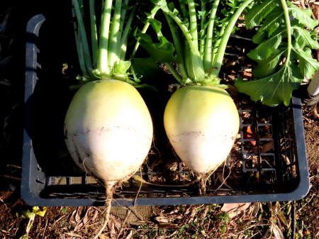 ★R7年9月13日、聖護院大根の種を蒔きました。 ★R7年10月23日、聖護院大根の様子です。(写真⇒左) ★R7年12月3日、大根の部分も大きく丸くなって来ています。(写真⇒右)