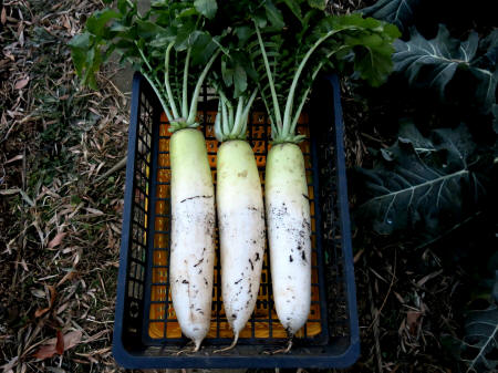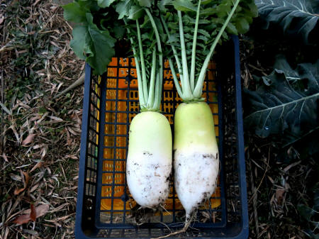 ★R7年9月15日、大根あじまるみの種を蒔きました。 ★R7年10月23日、大根あじまるみの様子です。(写真⇒左) 少ししたら2回目の間引きをします。 ★R7年12月3日、大根の部分が大夫太なって来ています。(写真⇒右)12月中旬頃には収穫したく思います。